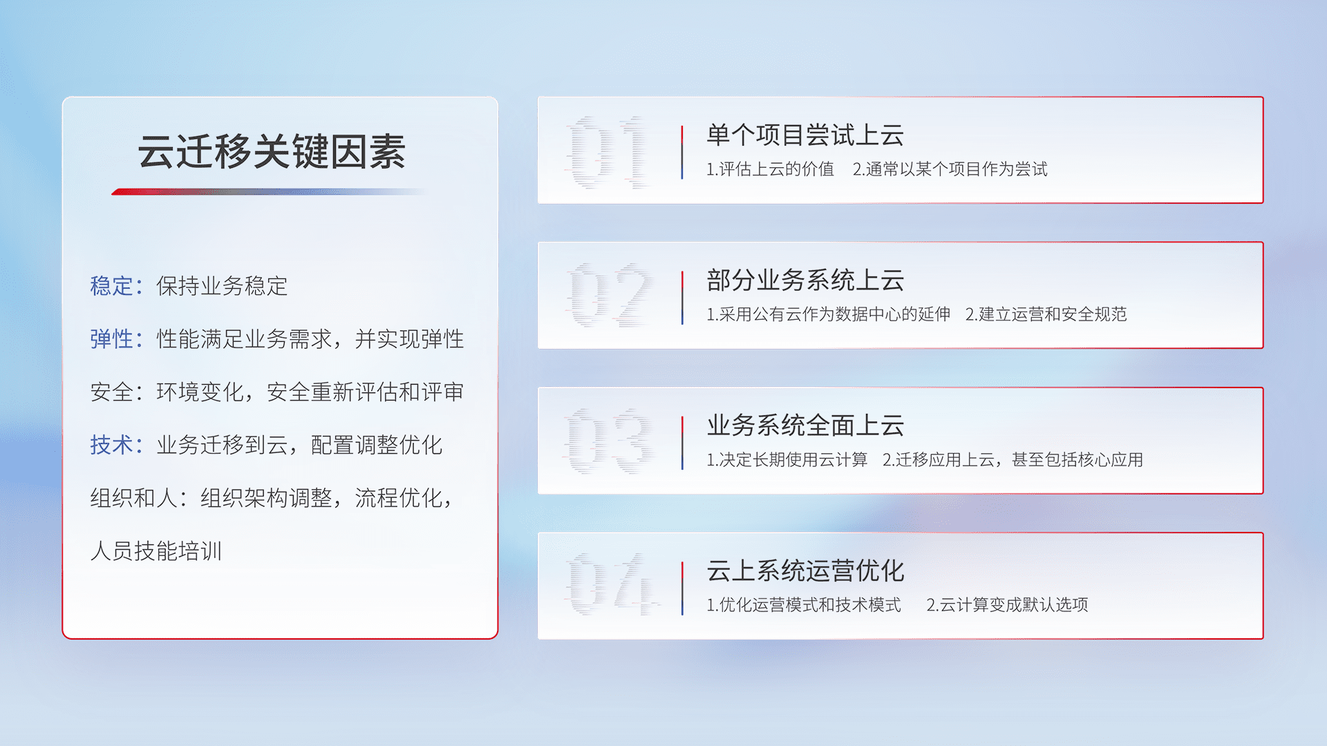 结合实际业务,,从规划设计、、云平台选型、、、、云原生改造、、数据迁移、、集成交付,,,,迁移全过程为客户识别最佳上云路径,,做好风险识别管理,,,,设计网络架构、、、身份权限、、、、安全审计合规、、、、操作审计、、、日志审计、、监控告警策略、、多站点容灾设计等,,对云上基础设施进行整体规划,,,,提升IT治理水平,,,以满足弹性、、、、高可用、、、、高性能的需求。。